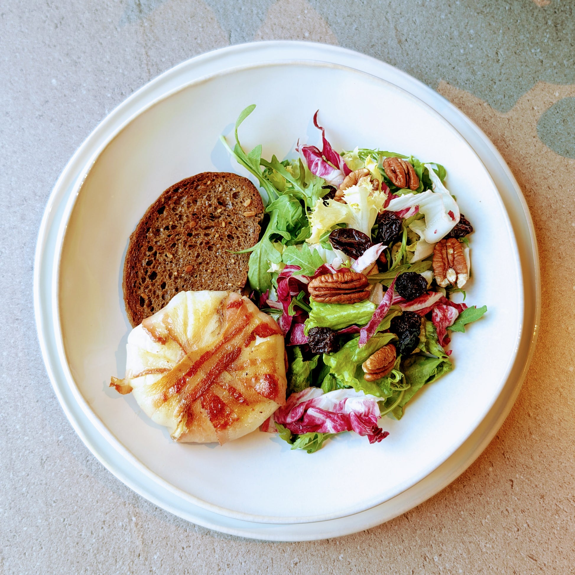 La base è semplice e genuina: un letto di insalata fresca e croccante, arricchita da verdure di stagione. Sopra, adagiato con cura, un tomino caldo e filante, avvolto da un abbraccio irresistibile di pancetta croccante. Il contrasto tra la freschezza dell’insalata e il calore del formaggio crea un equilibrio perfetto, leggero ma ricco di gusto.